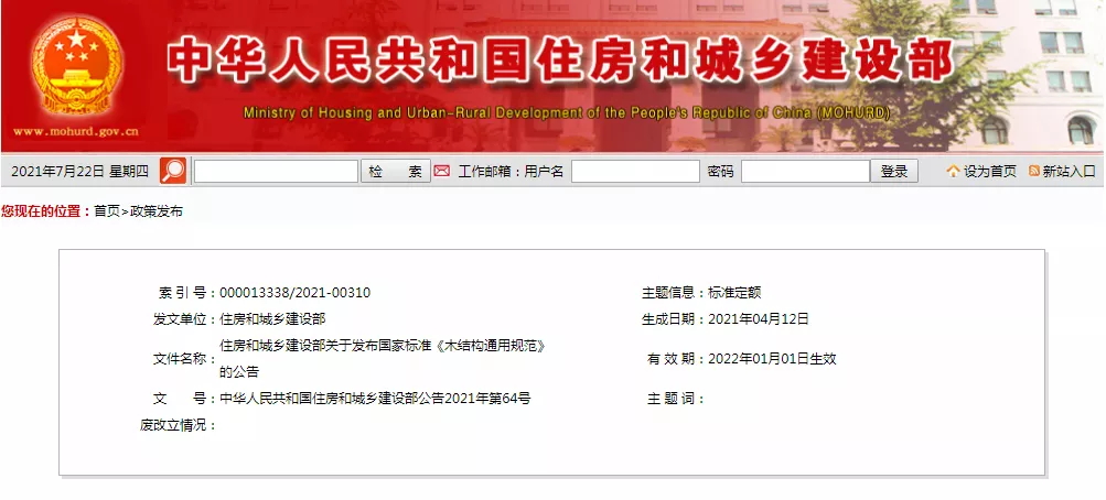 现批准《木结构通用规范》为国家标准,编号为GB55005-2021,自2022年1月1日起实施。本规范为强制性工程建设规范,全部条文必须严格执行。现行工程建设标准相关强制性条文同时废止。现行工程建设标准中有关规定与本规范不一致的,以本规范的规定为准。
