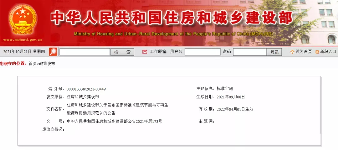 现批准《建筑节能与可再生能源利用通用规范》为国家标准,编号为GB 55015-2021,自2022年4月1日起实施。本规范为强制性工程建设规范,全部条文必须严格执行。现行工程建设标准相关强制性条文同时废止。现行工程建设标准中有关规定与本规范不一致的,以本规范的规定为准。