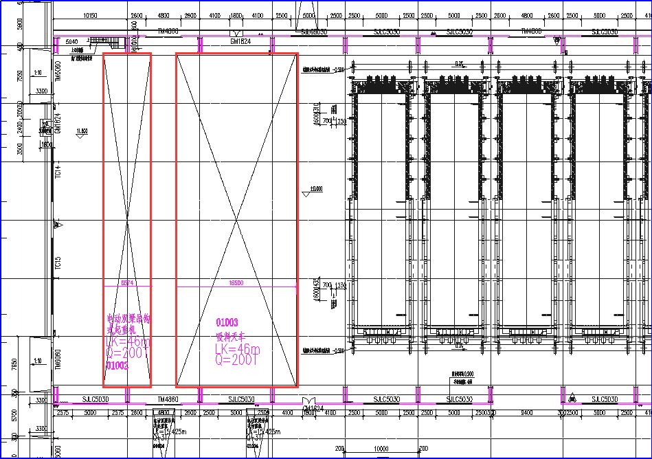 图中吊车位置主跨48m,有两台A8级重型吊车。施工图中表示,两台吊车均为50吨的A8级重型工作制吊车。检查结构设计模型,设计院采用两台普通的50吨吊车进行组合。