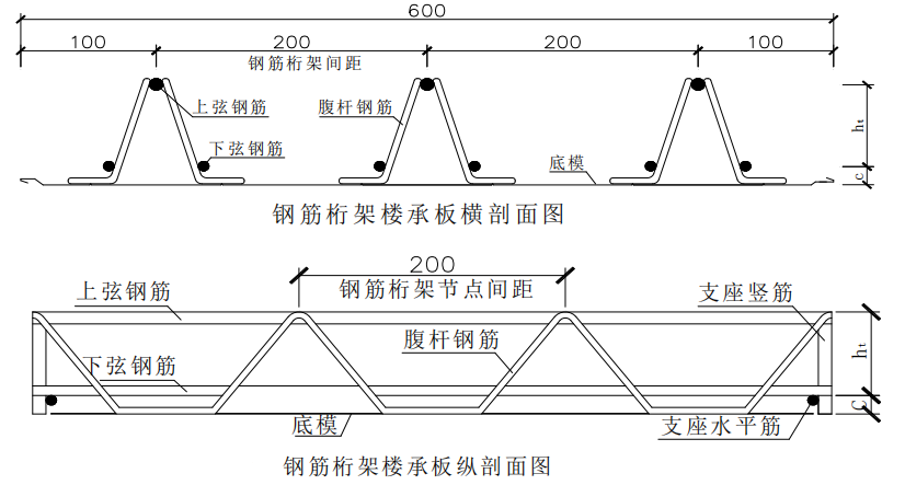 使用阶段:桁架上弦及下弦筋可作为楼板顶筋及底筋与混凝土共同作用,不考虑钢筋桁架整体、桁架腹杆及底模的组合作用。可按单向板板或双向板设计,垂直于桁架方向楼板钢筋同混凝土板配筋要求。