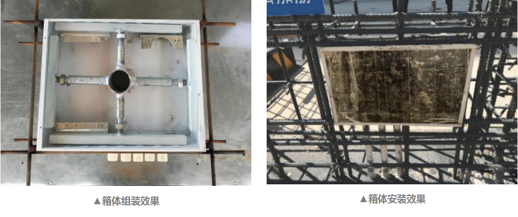 采用方管、钢管、螺杆、螺帽材料,根据箱体尺寸下料,焊接作为箱体内支撑,通过螺帽调节、拆卸。此箱体支撑做法,拆除后可重复使用,大大降低了传统做法模板材料浪费,拆模后观感质量有所提升。